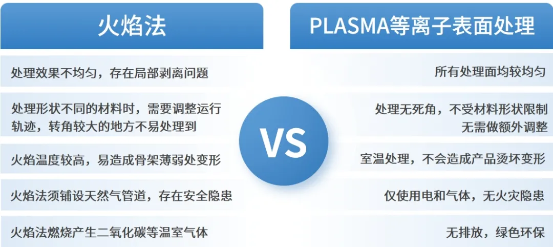 與火焰法相比,等離子表面處理具有處理效果均勻、無明火室溫處理,材料不易燙壞變形、環保無污染和適用范圍廣等優點。